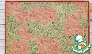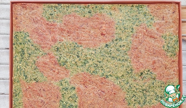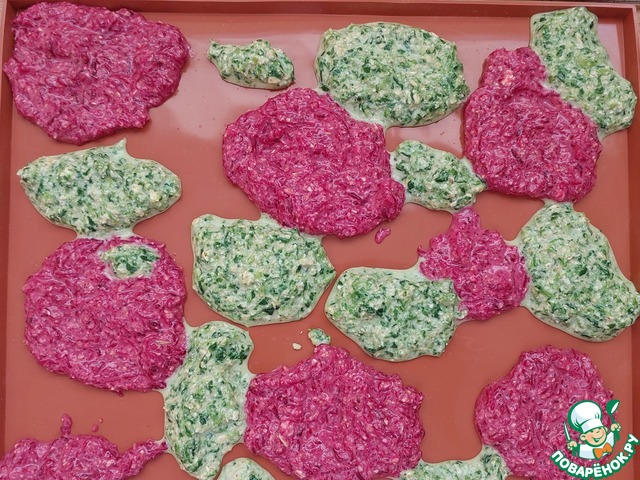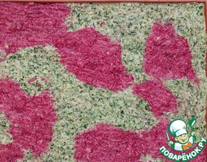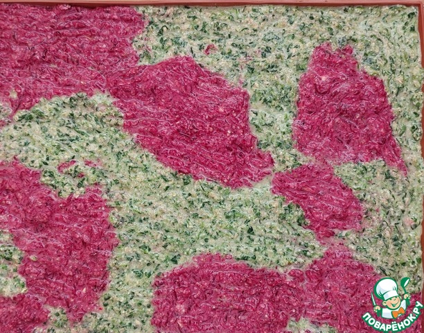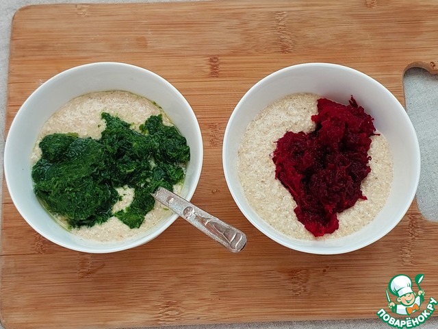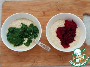 Тесто разделить на две части, в одну добавить размороженный шпинат, в другую - предварительно почищенную и натертую на мелкой терке свеклу. Перемешать. Обе смеси должны получиться примерно одной густоты. Если одна получилась гуще - нужно разбавить кефиром.