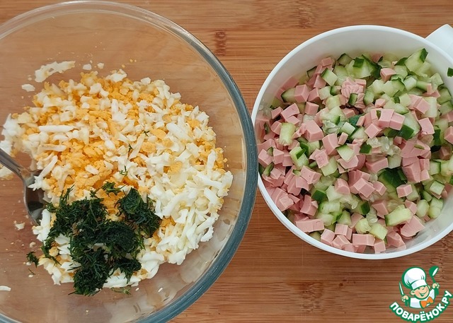 Пока выпекается корж займемся начинкой. Для начинки/салата огурец и сосиску порезать мелкими кубиками, яйцо - натереть на крупной терке. Все ингредиенты начинки объединить и перемешать. Попробуйте начинку: если нужно подсолите и добавьте специй по вкусу. Я для этого в начинку кладу сосиску и мне достаточно вкуса, иных специй и соли не добавляю.