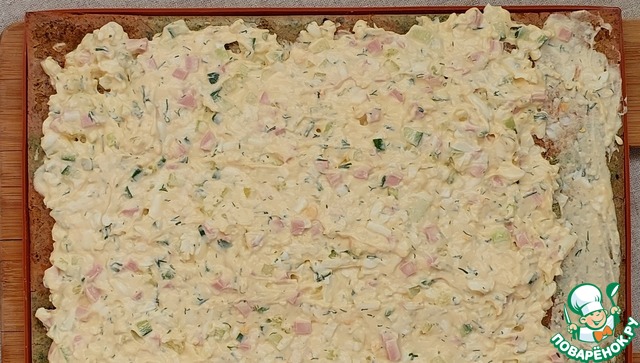 Равномерно размазываем салат/начинку по коржу. Один край, который будет швом следует смазать слегка, во избежание выползания начинки.