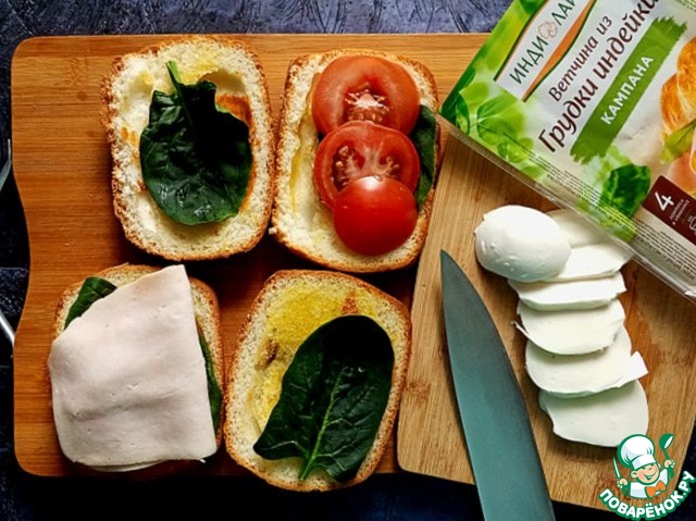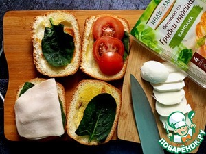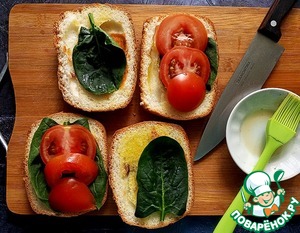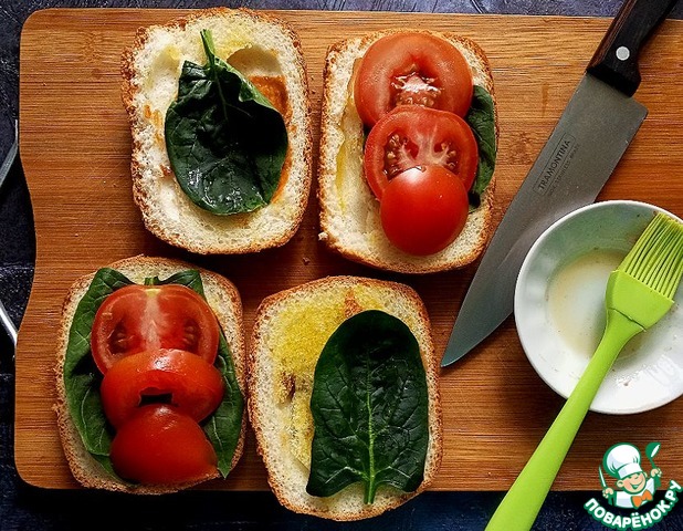 Так как блюдо итальянской кухни, я буду в нём использовать фокаччу. Можно взять чиабатту. Так как я пеку такой хлеб сама, то возьму домашнюю фокаччу. Кому интересен рецепт, то я дам ссылку ниже. Просто вместо круглой фокаччи, я выпекла 2 прямоугольные из количества данных ингредиентов в рецепте. Я разрезала обе напополам вдоль. Получилось 4 куска. Немного выгребите мякиш внутри, не повреждая целостность кусков. Подсушите куски на сковороде и натрите сразу чесноком. Я промажу совсем чуть-чуть горчицей. Это не обязательно. Смазываем куски поверх горчицы оливковым маслом. Сверху выкладываем по листику шпината и на него - дольки помидора. Вместо шпината можно взять зелёный базилик. Некоторые не очень его любят и поэтому можно заменить шпинатом.