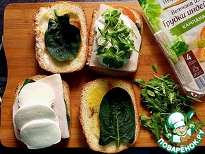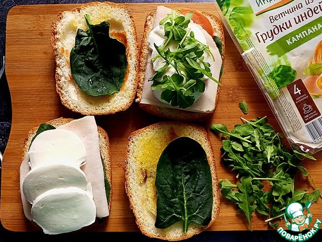 Выкладываем Моцареллу на ветчину и присыпаем рукколой. Накрываем сверху собранную начинку вторым, так же промазанным и с листиком шпината, куском.
