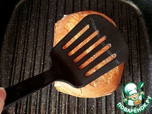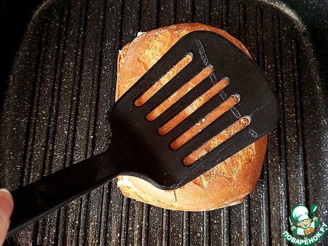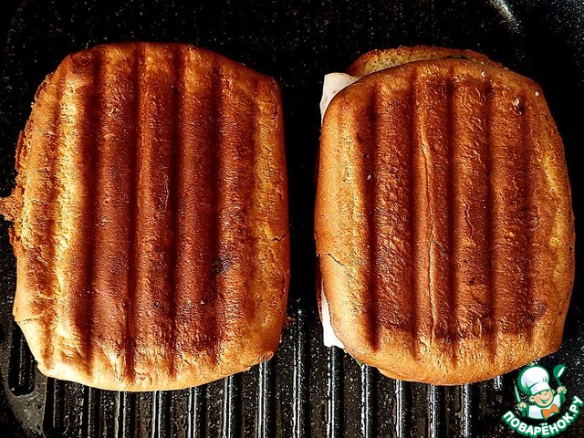 Греем сковороду - гриль. Выкладываем панини. Прижимаем ко дну лопаткой и готовим до образования румяных полосок, примерно 2–3 мин. Перевернём и продолжаем готовить еще 2 мин. Это 1 вариант обжарки.