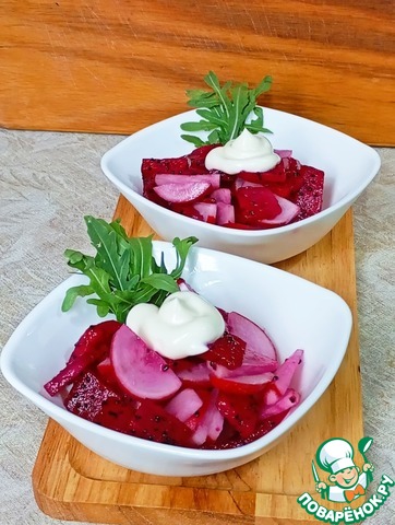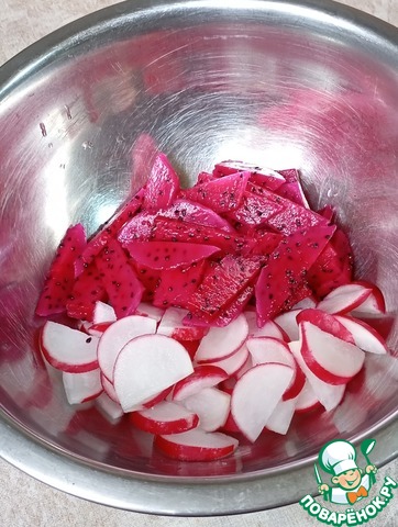 Но деть попробовал и отказался, по виду свеклу напомнило. Фруктовый салат я делала, а тут и редиски много оказалось, эксперимент удачный получился.