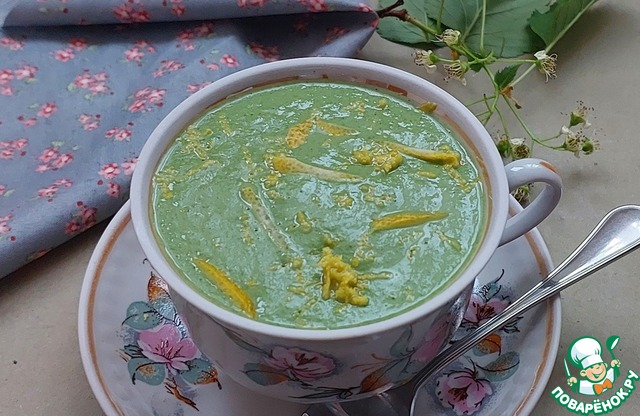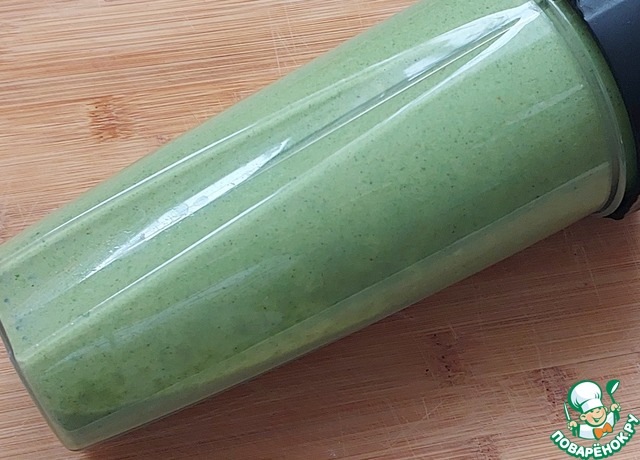 Изумрудный шпинатный смузи приятной кремовой консистенции с добавлением порошка сушеного киви.