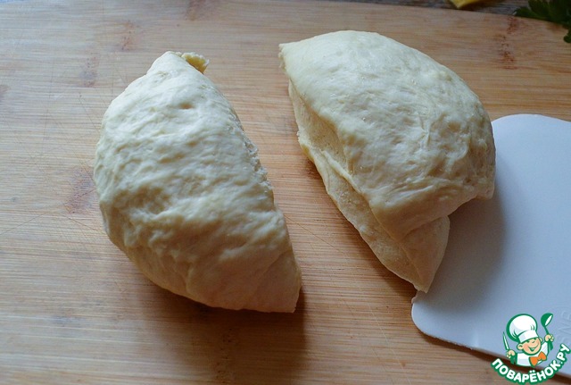 Раскатать в большой овал, 0,5 см. толщиной. Ломтик сыра разрезать на четыре полоски, положить по краям.