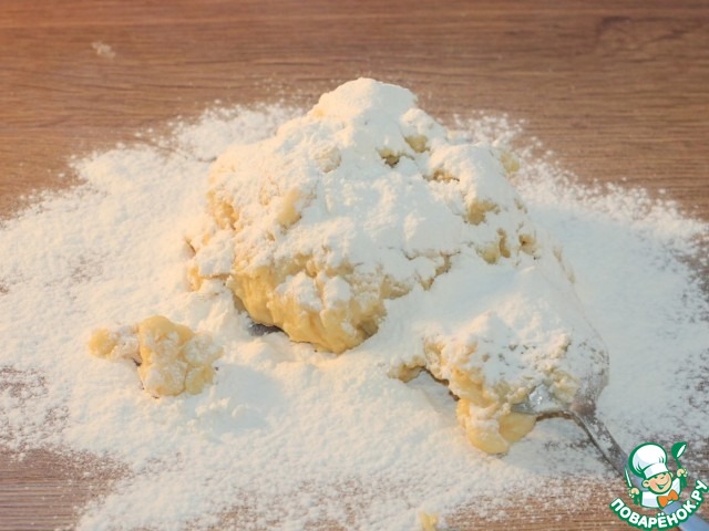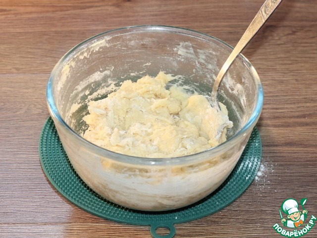 6. Небольшими частями всыпаем мучную смесь и замешиваем тесто...