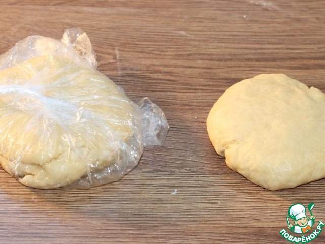 9. Собираем тесто в ком и делим на 2 части. Затем округляем и кладем в прозрачный пакет. Убираем в холодильник.