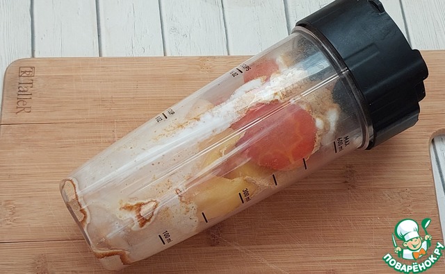 Измельчить и взбить. Смузи получается густой, красивого персикового цвета структура нежная, гомогенная. Объем примерно 500мл