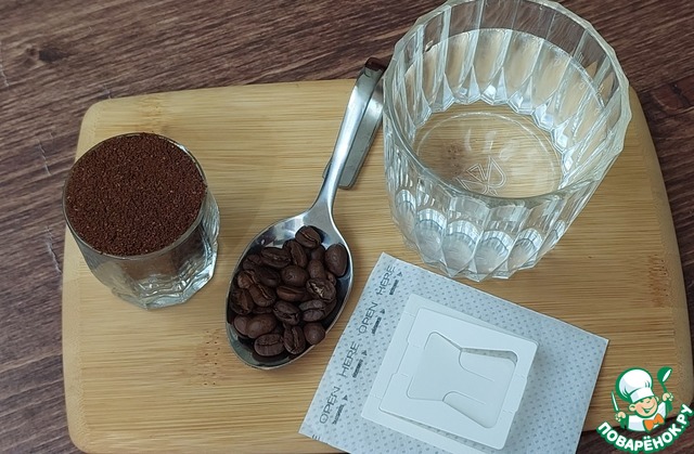 Ингредиенты для кофе. Можно использовать как готовый молотый кофе, так и зерновой, свежесмолотый. От качества кофе напрямую зависит вкус напитка. Также понадобится фильтр для процеживания напитка.