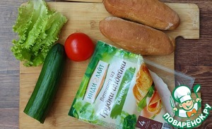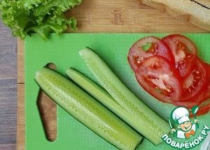 Огурец нужен почти на всю длину бутерброда, огурец разрезать пополам, половину еще пополам. Нужно будет две четвертинки. Помидор порезать тонко. Разумеется, овощи и салат нужно предварительно вымыть и высушить.