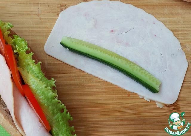 Дальше собираем бутерброд. Огурец укладываем на ветчину как на фото