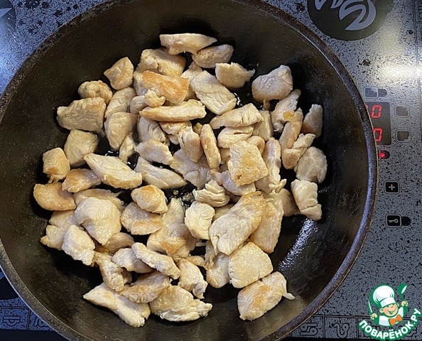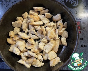 Стейк индейки, нарежьте на небольшие кусочки и обжарьте до полуготовности.