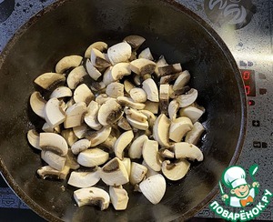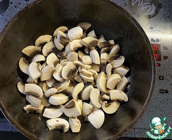 Шампиньоны нашинкуйте не сильно мелко и так же, обжарьте до румяного цвета.