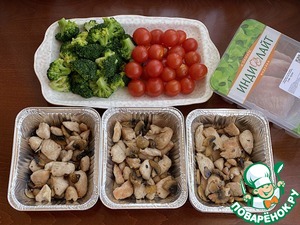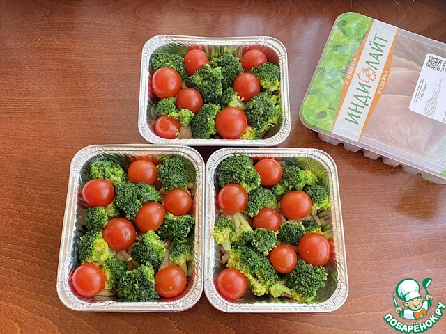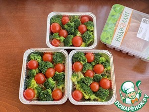 Сверху на индейку с грибами, распределите брокколи и помидоры черри.