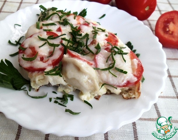 Сверху - нарезанные тонкими кружками помидоры, и посыпать все тертым сыром.