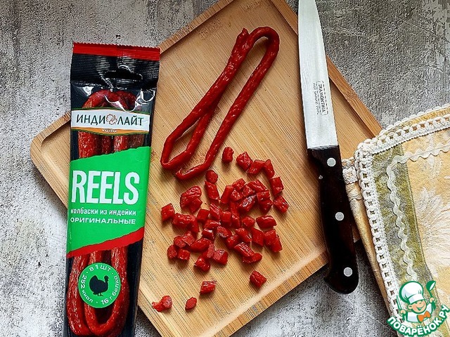 • В рецепте я буду использовать колбаски Индилайт Снеки из индейки оригинальные. Нарезаем колбаски произвольно.