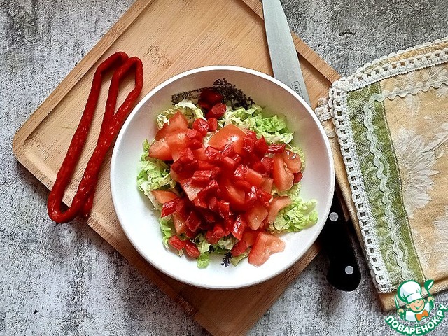 • Помидор нужно разрезать и удалить мякоть из него. Оставить только твёрдую часть. Мякоть используйте в другом блюде. Я в салате буду использовать пекинскую капусту - ярко зелёные листики у неё. Берём салатник, выкладываем пекинскую капусту.
