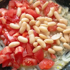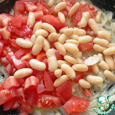 Лук нашинкуйте тонкими полукольцами. Помидоры очистите от кожица и нарежьте небольшими кубиками. С фасоли слейте жидкость. Разогрейте на сковороде масло на среднем огне и пожарьте в нем лук, помешивая пока он не станет прозрачным, 5 мин, добавьте помидоры и фасоль. Перемешайте, посолите, поперчите и уберите с плиты.