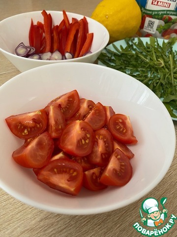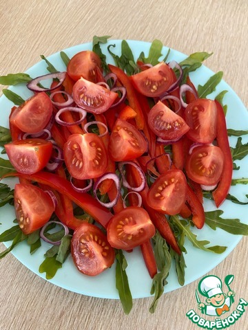 Выложите в салатницу первым слоем рукколу, затем положите перец, сверху лук и потом уже томаты;