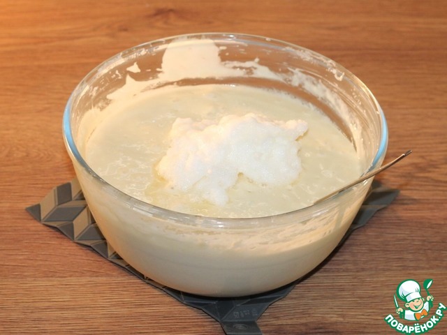 8. Затем аккуратно вмешиваем белки в тесто. В результате получается тесто в белковых хлопьях.