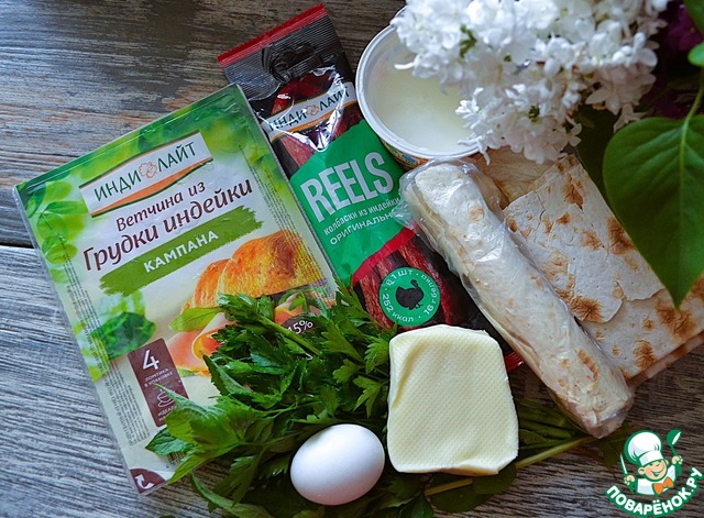 Ингредиенты для «Пирог из лаваша с ветчиной и колбасками»: