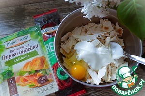 Лаваш накрошить мелко, выложить в миску. Добавить сливки, сметану и яйцо. Перемешать.