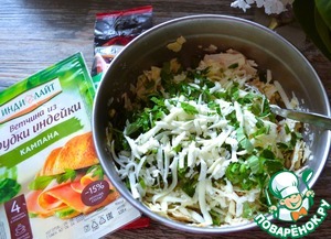 Зелень вымыть, обсушить, нарубить, моцареллу натереть. Добавить в миску.