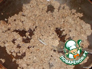 Фарш выложить на сковороду и, раздавливая его вилкой, мешать. Посолить, поперчить, добавить лавровый листик. Слегка все обжарить.
