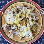 Положить капусту в фарш и добавить воду. Закрыть крышкой и тушить на среднем огне примерно 10 мин. Посолить.