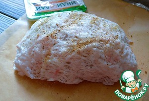 Бедро обсушить, посолить и посыпать специями с обеих сторон. Их Вы можете взять по вкусу.