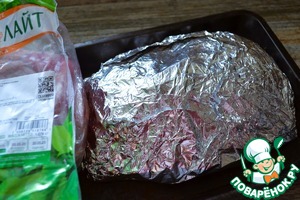 Запекать в духовке 2,5 часа, 150-160 градусов. Затем аккуратно открыть и довести до желаемого румянца, 5-7 минут, 230 градусов.