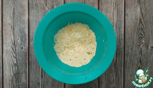 Смешать сухие ингредиенты и добавить мелко порезанный репчатый лук.