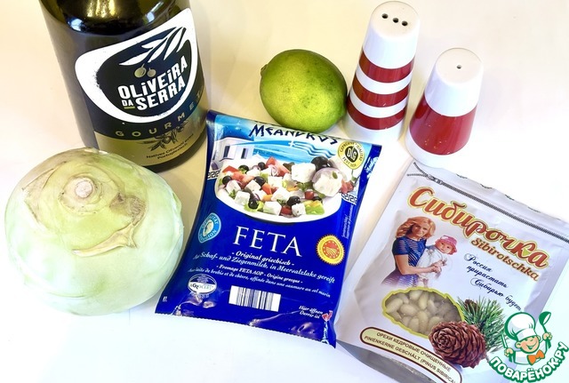 • Фету раскрошить на кольраби, посыпать орехами и зеленью.