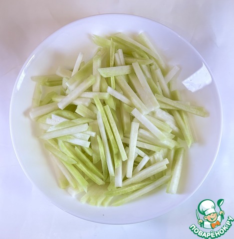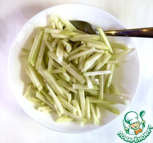 • Кольраби почистить, натереть шайбами по 0,5 см и нарезать длинной соломкой.