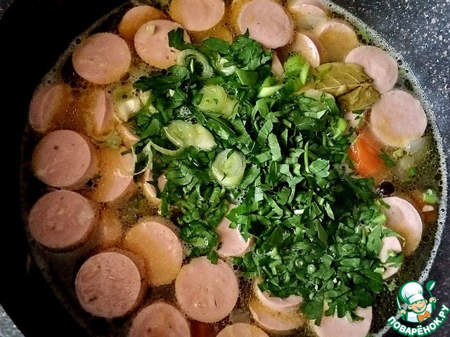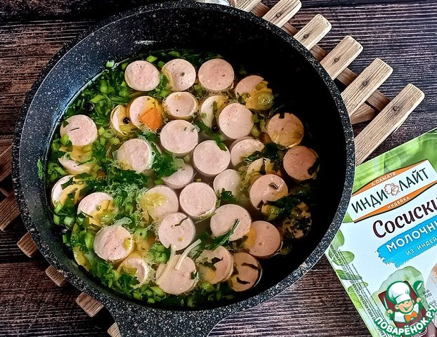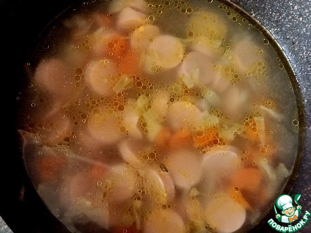 С горошка сольём жидкость и отправим в казан. Туда же - порезанные сосиски. Варим ещё минут 5, посолим по вкусу.