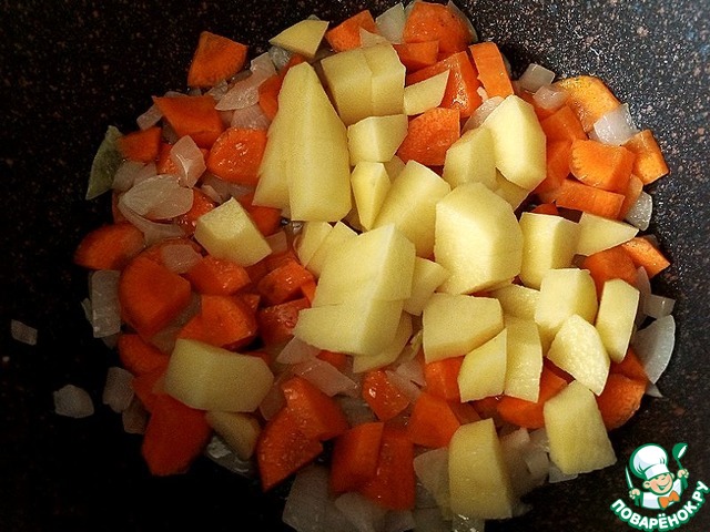 В казан наливаем немного масла подсолнечного рафинированного и выкладываем в начале лук. Золотим его до мягкости. Добавляем картофель и морковь. Немного притомим, постоянно помешивая, чтобы не пригорело, а то вкусно не будет. Морковь и картофель пропитаются луковым маслом.