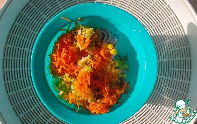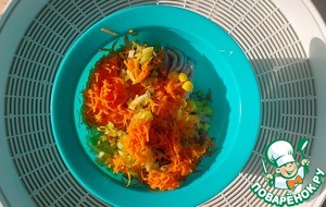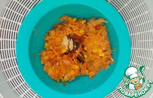 Морковь очистить и натереть на мелкой терке. Сельдерей натереть на крупной, он будет махриться, махрушки порезать ножом. Проростки промыть и порезать, лук натереть на мелкой терке.