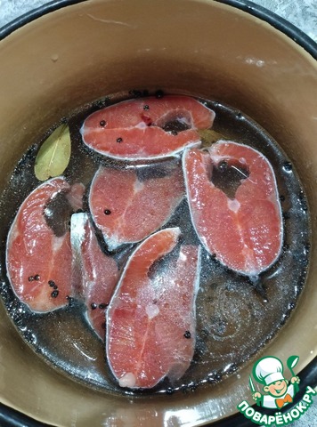 Приготовить рассол - вскипятить 1 литр воды с 7 столовыми ложками с горкой соли и специями. Остудить. Пока рассол остывает, приготовить рыбу. Рыбу лучше брать замороженную (из охлажденки не готовили ). Чуть разморозить, чтобы лучше было разрезать и не развалилась. КУсочками примерно толщиной по 1 см. Голову и хвост не используем (на уху уйдут). В остывший рассол укладываем наши кусочки рыбы на 1 час.