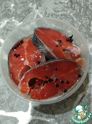Рецепту много лет, готовили еще мои родители... В то время - горбушу. Сейчас выбор большой красной рыбы. Утром приготовили, вечером можно кушать, угощать гостей. Я в этот раз солила форель. Удобно, вкусно и быстро.