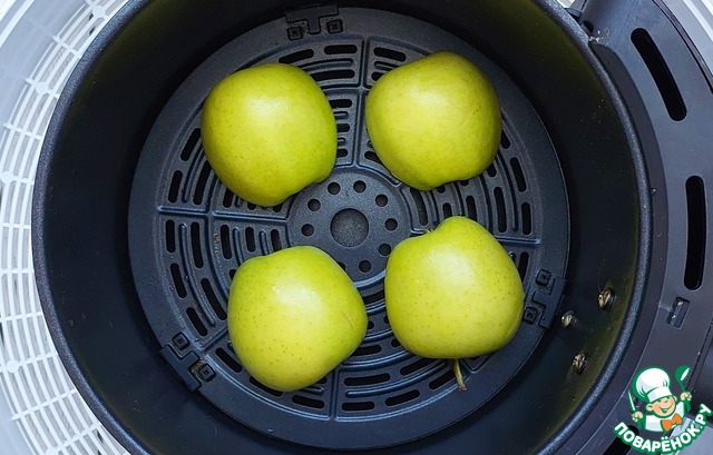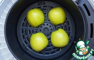 Сначала займемся подготовкой яблок. Вымытые и высушенные плоды разрезать пополам вдоль семенной коробочки и запечь удобным способом до полуготовности. Я это делаю в аэрогриле при Т 180° 10 минут.