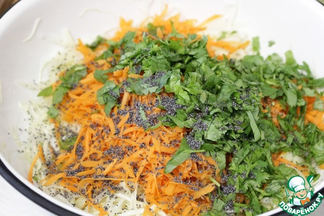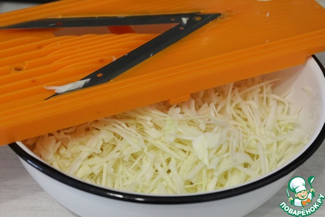 Капусту тонко нашинковать, выложить в большую миску и немного помять её, чтобы она стала более мягкой.