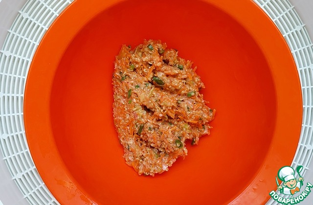 Морковь натереть на мелкой терке, стебель сельдерея - на крупной, дополнительно, если сельдерей сильно размахриться, порезать ножом. Зеленый лук так же измельчить ножом.