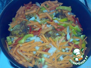 Добавляем овощи, перемешиваем, обжариваем 5 минут, затем накрываем крышкой и тушим еще 15-20 минут (до готовности).