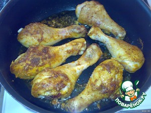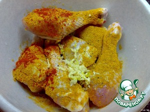 Куриные ножки солим, перчим, добавляем карри (2 чайн. ложки), немного паприки и молотого черного перца, выдавливаем чеснок. Все хорошо перемешиваем и отставляем на полчасика, чтобы курочка пропиталась ароматами специй.