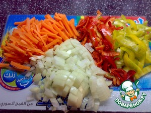 Моем, чистим и режем овощи: морковь и перец – соломкой, лук – кубиками.