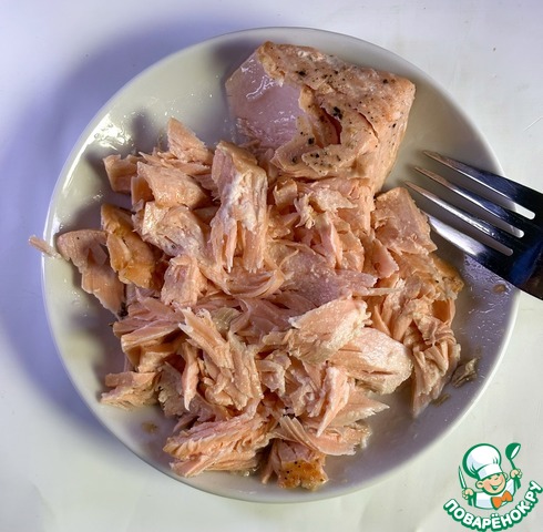 - Лосось (у меня приготовленный на пару) — 120 г