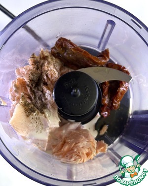 В блендер положить рыбу, вяленые томаты, по щепотке соли и перца, влить 2 ст. ложки сливок. Пробить до однородности.