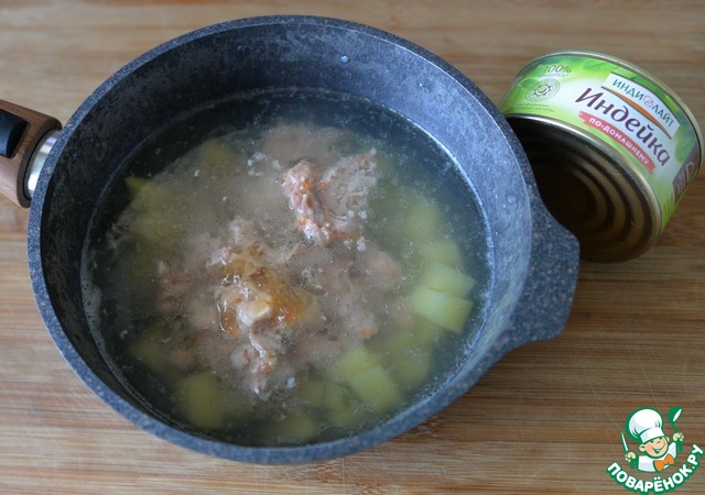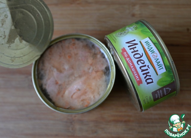 Берём тушёнку, у меня - индейка по-домашнему ТМ Индилайт, слегка разминаем вилкой, чтобы не было больших кусков.