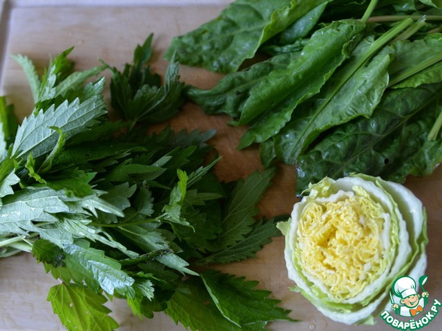 Берём пекинскую капусту, щавель и крапиву. Можете что-то заменить, например, взять шпинат. Можно взять молодую зелёную капусту, тогда следует её положить через 5 минут после варки картофеля.