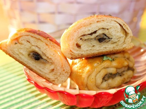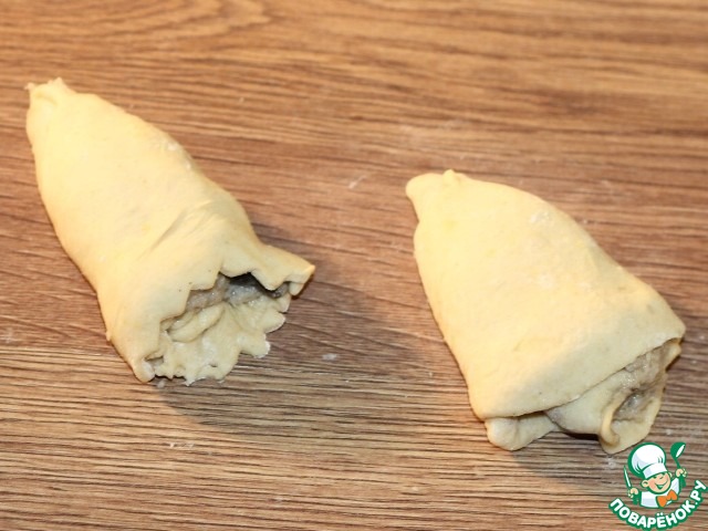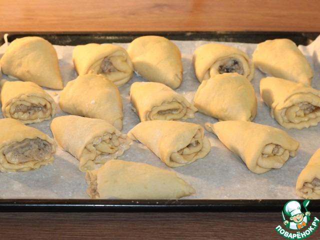 14. Застилаем противень пекарской бумагой, смазываем холодным сливочным маслом и раскладываем заготовки. Накрываем их пленкой или прозрачным пакетом и оставляем в теплом месте, минут на 20 или до увеличения в 2 раза. Затем смазываем взбитым яйцом и выпекаем в разогретой до 190 С духовке минут 30 или до готовности.